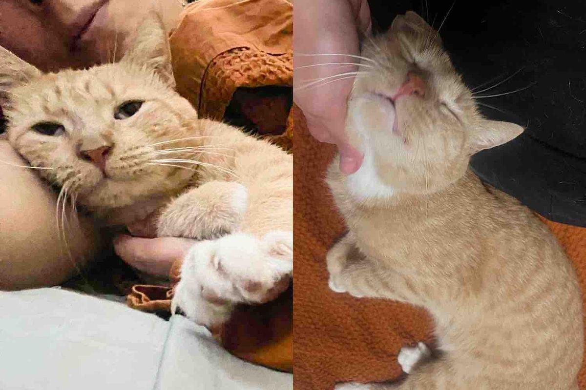 Chuck quickly embraced the comforts of indoor life: soft blankets, nourishing meals, and endless love. Before long, he snuggled against his foster mom, eyes closed, purring himself to sleep.