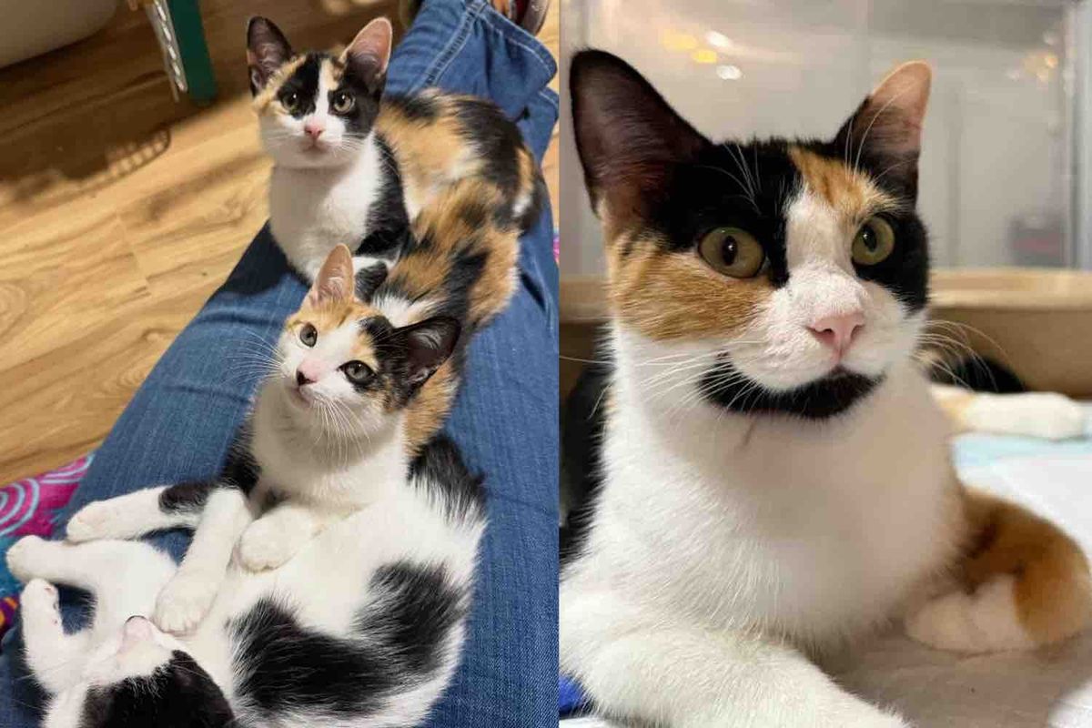 While checking the litter, Aimee was surprised to discover that all six kittens were girls: four calicos and two with adorable cow-like markings.